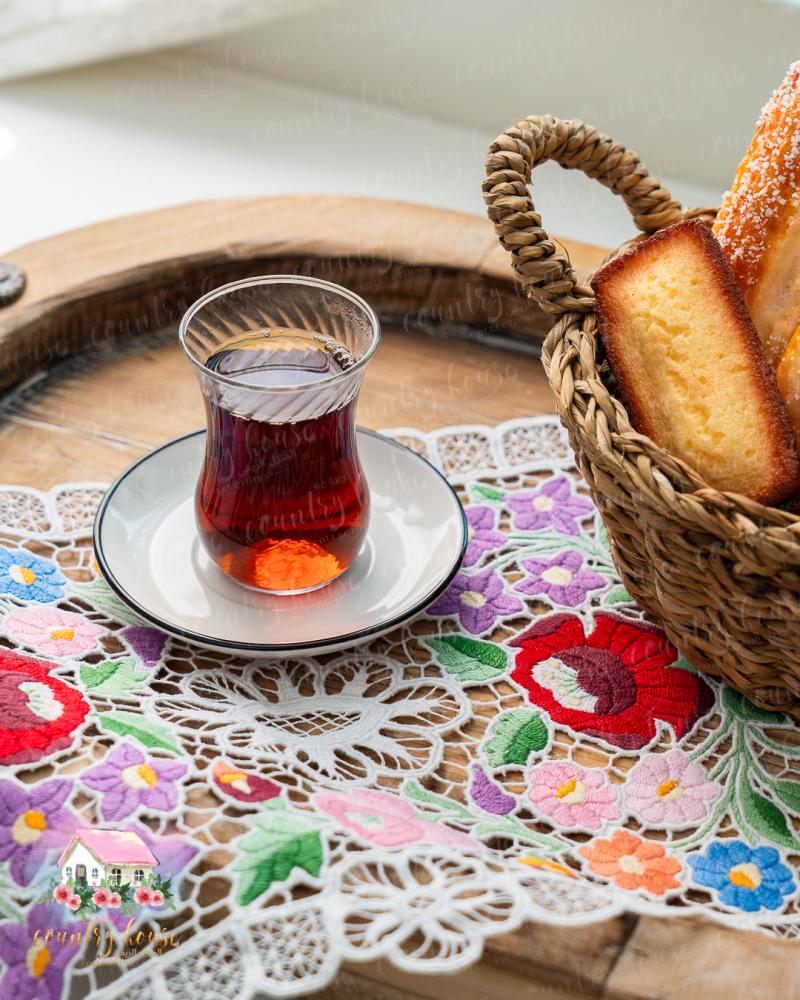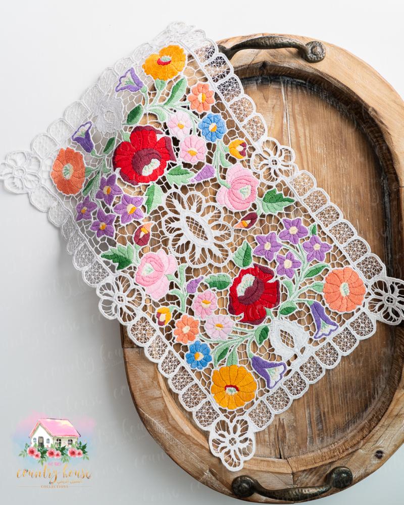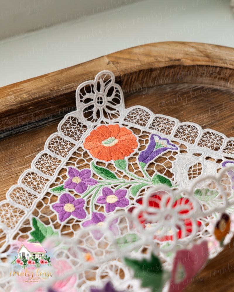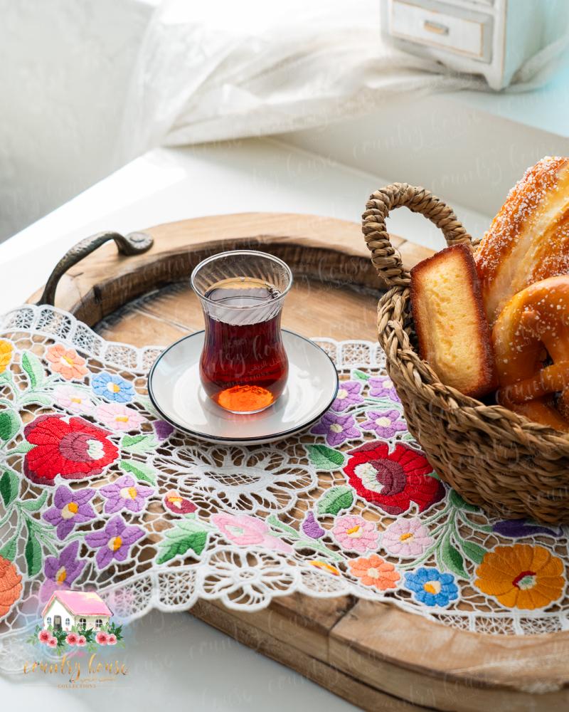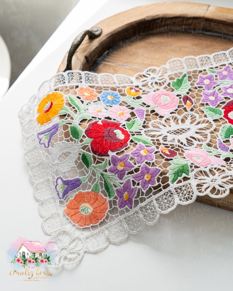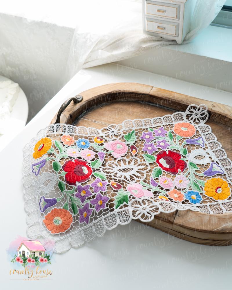 قطعة فنية مفعمة بسحر الألوان الزاهية، مطرّز يدويًا بتفاصيل زهرية نابضة تعكس الطابع الأوروبي العتيق، مثالية لتزيين صواني التقديم أو الطاولات الصغيرة بإحساس دافئ ومميز.