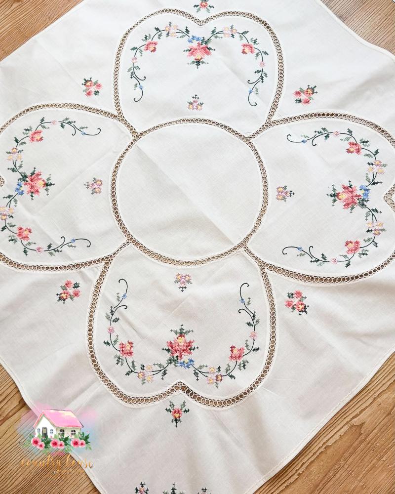 مفرش طاولة بتطريز يدوي ناعم داخل زخارف قلبية محاطة بدانتيل كلاسيكي. تصميم أنثوي أنيق مستوحى من بساتين الأزهار الريفية.